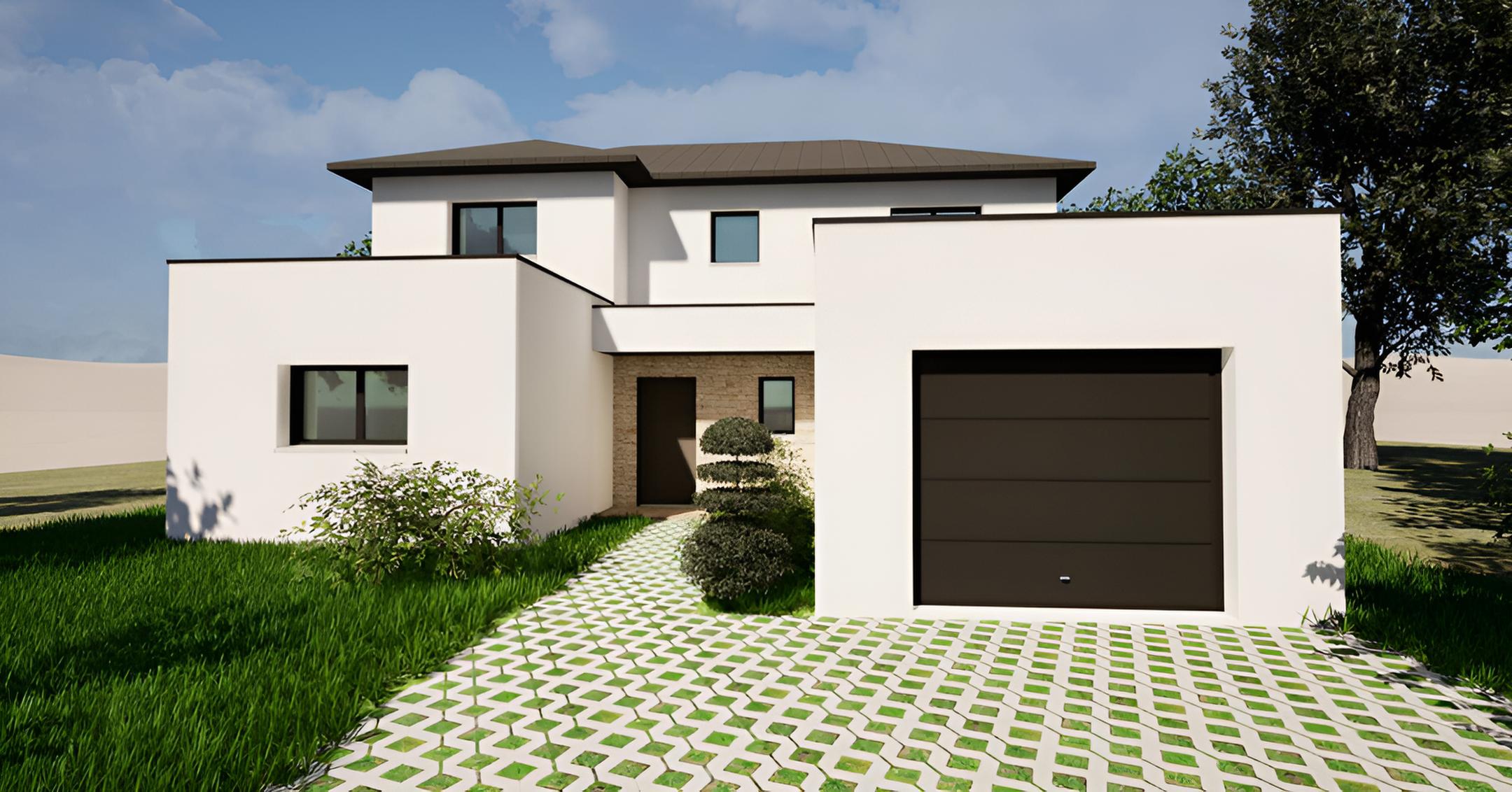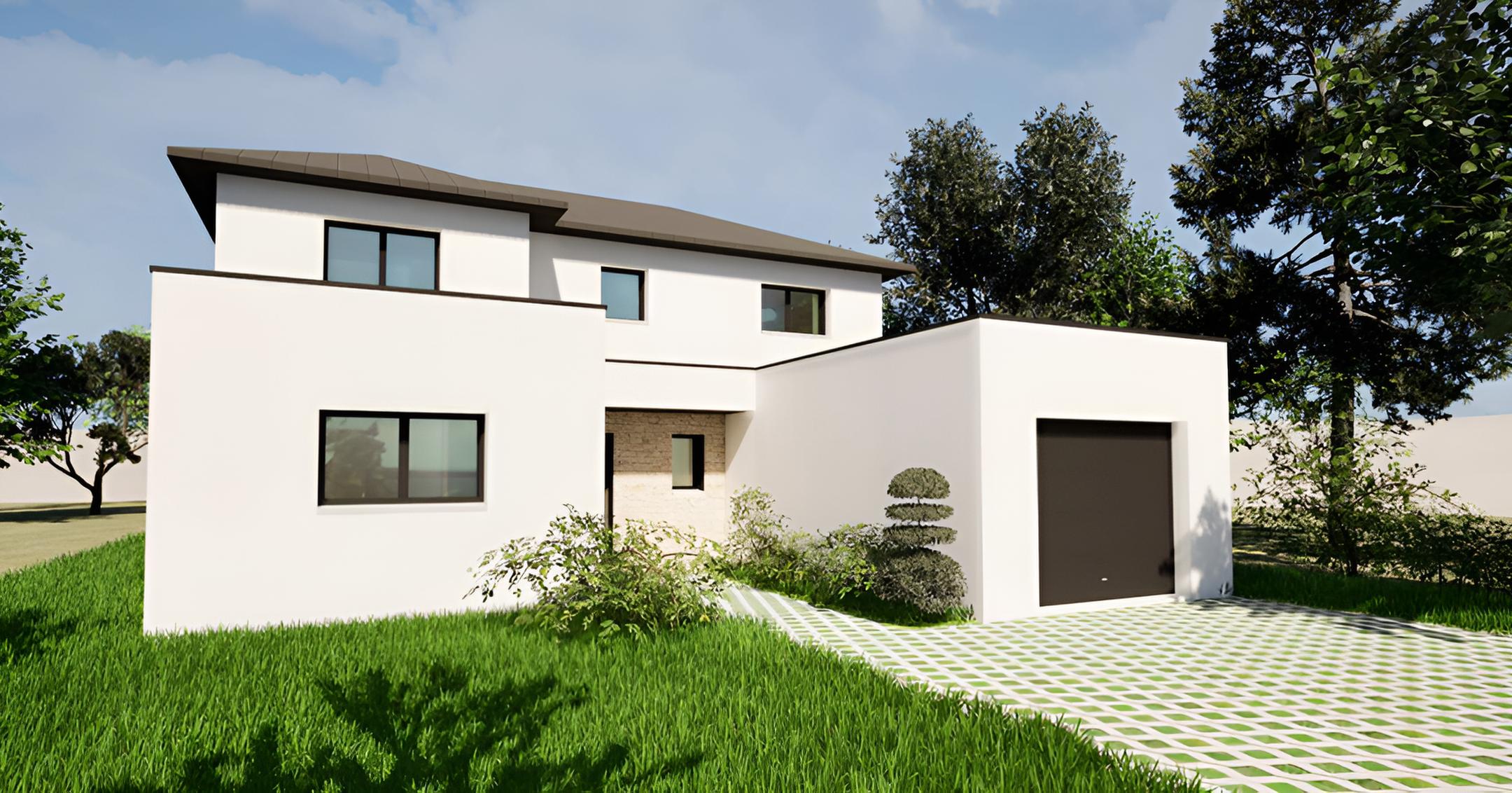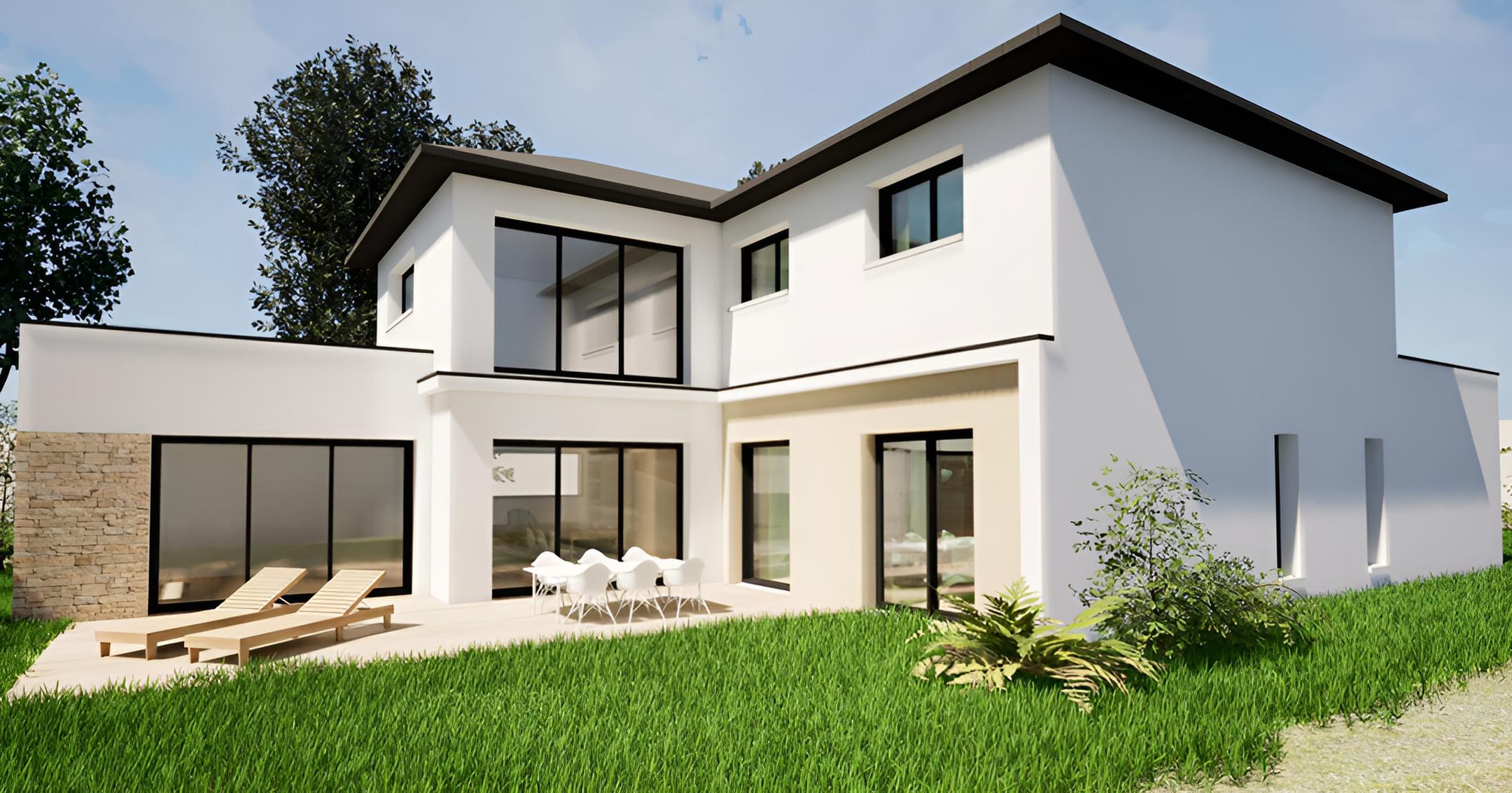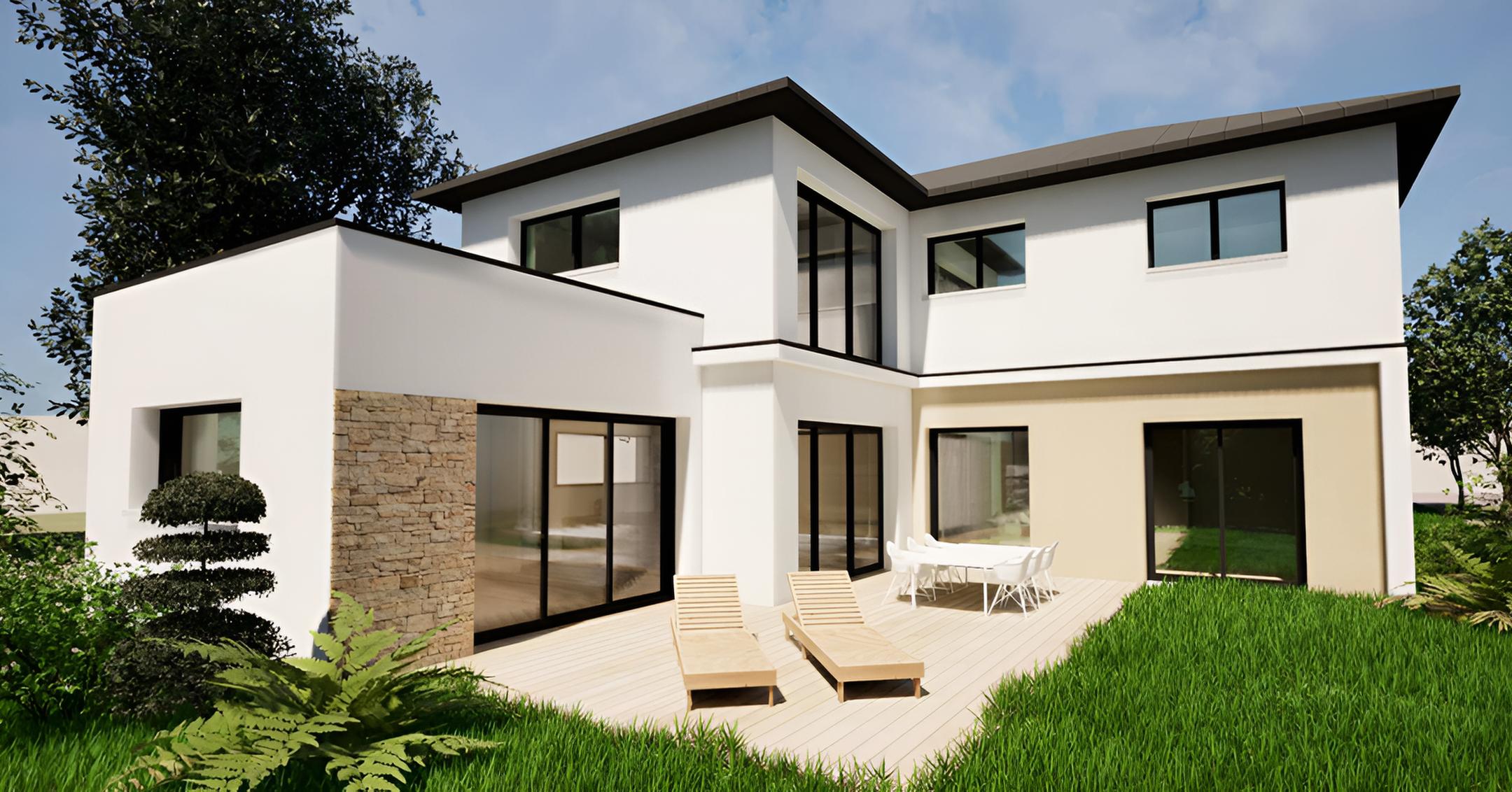 Cette construction à La Chapelle-des-Fougeretz se démarque par son architecture moderne qui mélange toit plat et toiture quatre pans. L’enduit blanc habille l’ensemble des façades, ponctué de parement en pierre au niveau de l’entrée avec un rappel discret côté terrasse. Les grandes baies vitrées inondent la maison de lumière et créent un lien avec l’extérieur.