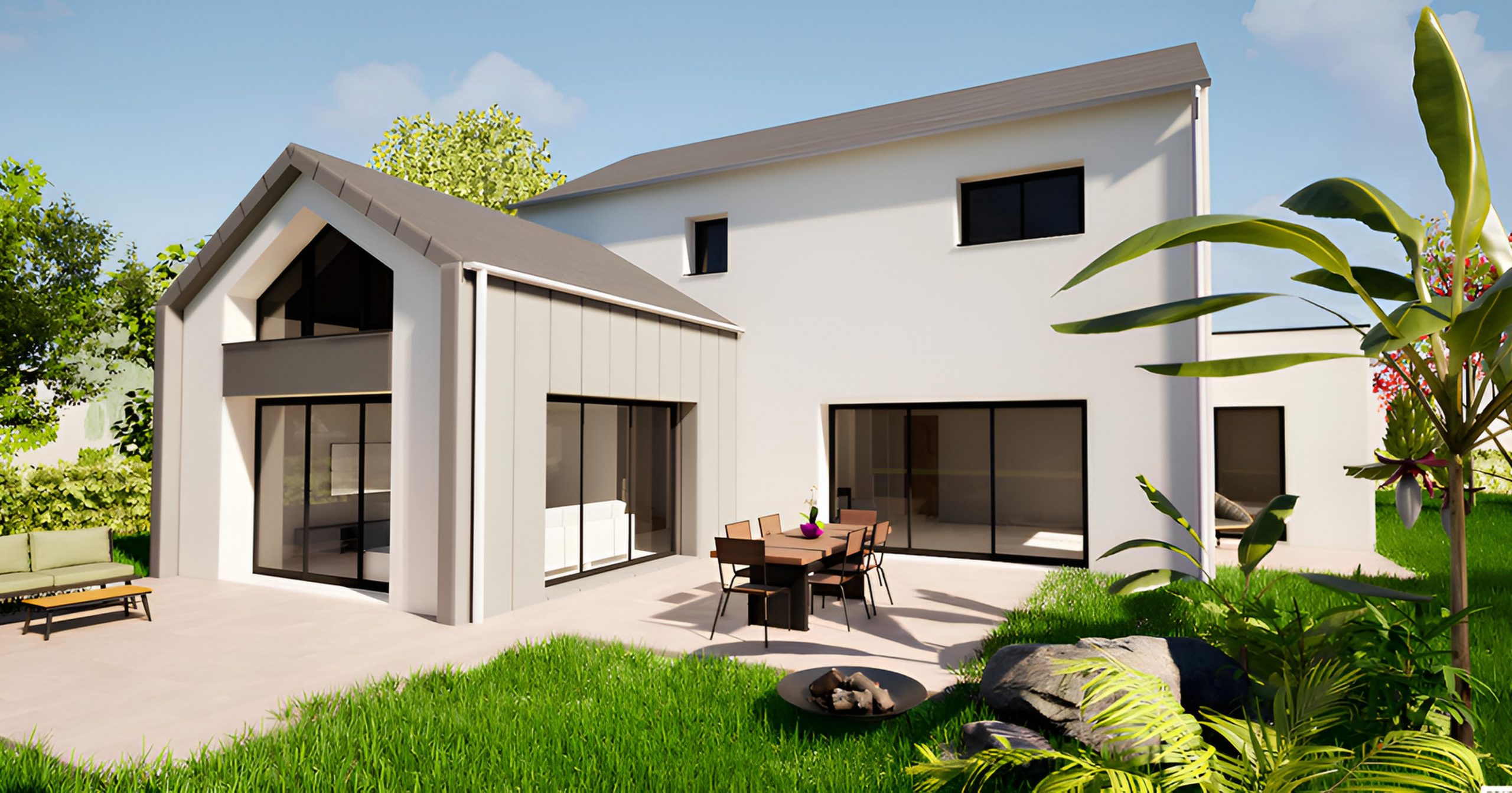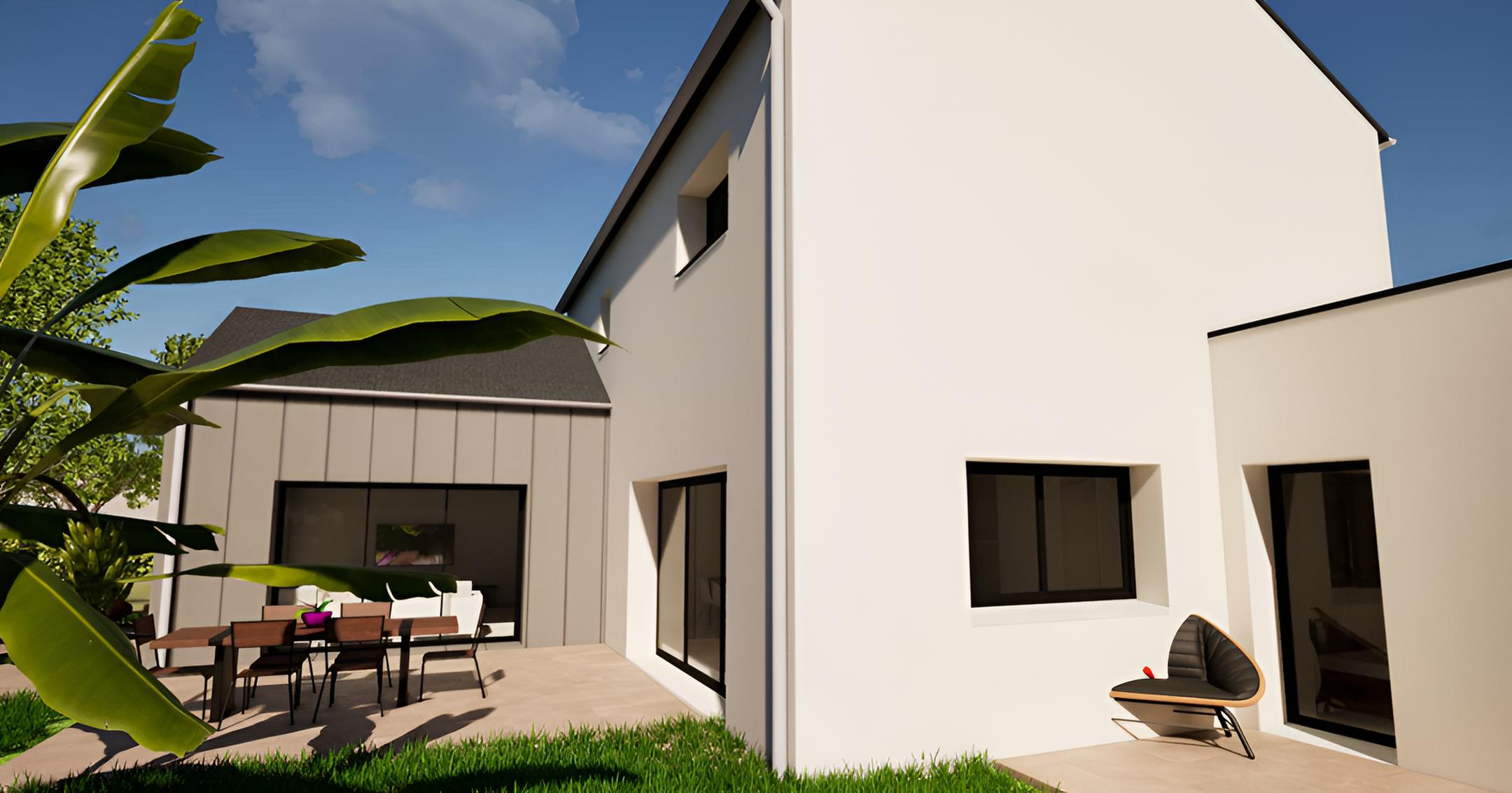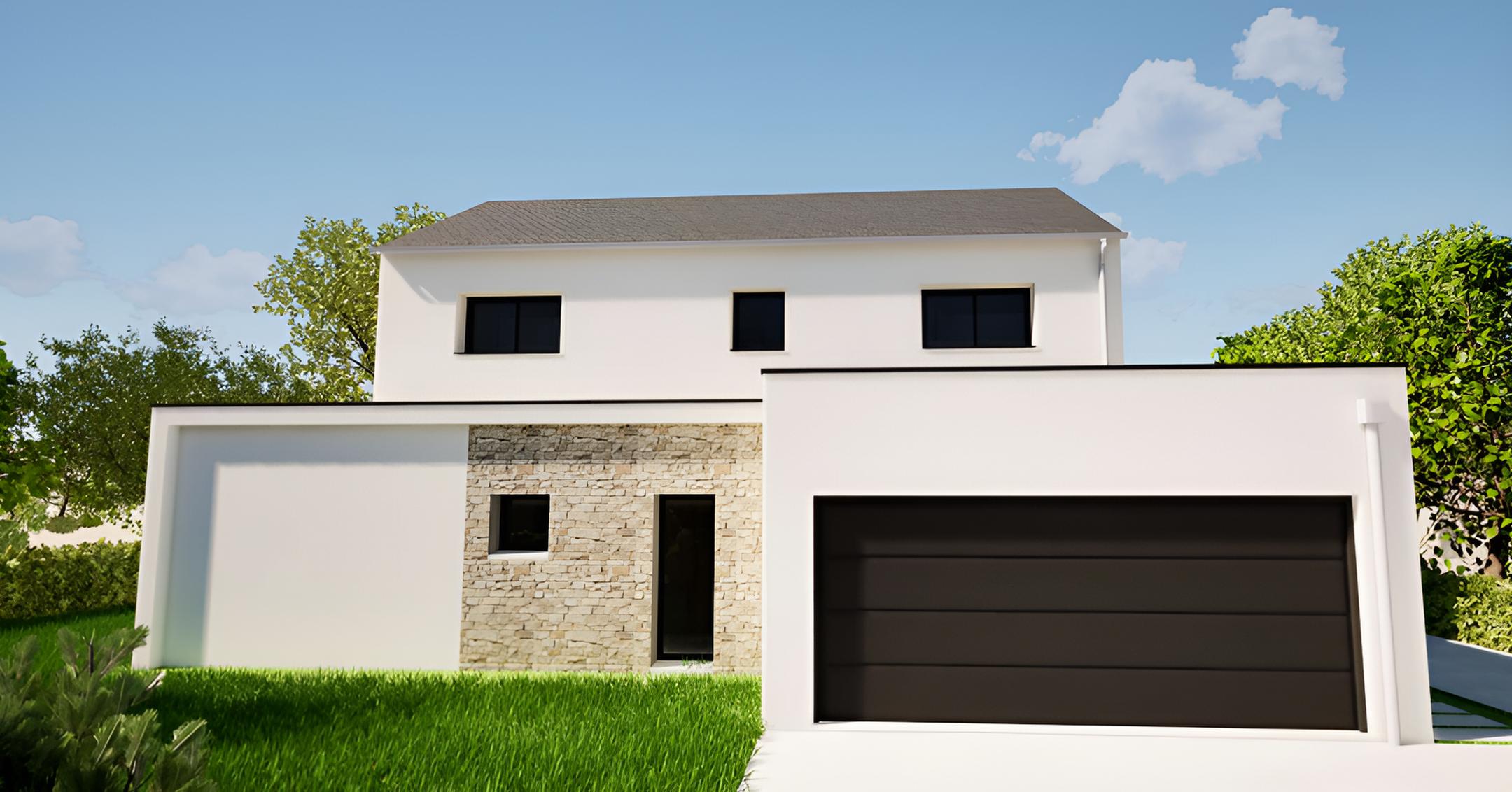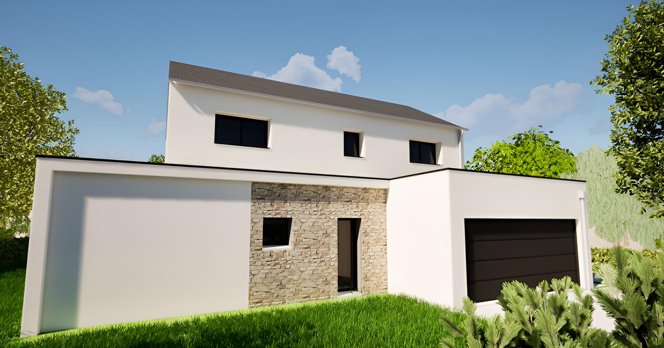 Ce nouveau projet à Pléchâtel affiche un style contemporain marqué par l’association de différents matériaux. Le parement en pierre naturelle au niveau de l’entrée apporte du caractère et met en valeur le devant de la maison. La peinture noire sur le pignon crée un contraste dynamique avec l’enduit blanc, tandis que le bardage alu complète le tout. Les menuiseries noires viennent souligner les ouvertures.