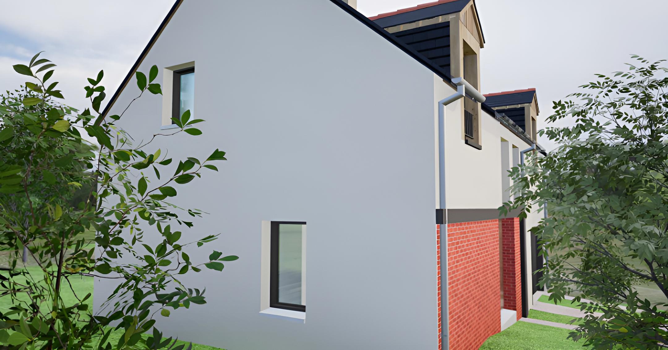 À l’étage, deux chambres ainsi qu’une salle de bain composent l’espace nuit complémentaire. À l’extérieur, la maison associe un enduit monocouche à un parement en brique et un pignon en bardage bois, tandis que les menuiseries aluminium gris apportent une touche contemporaine à l’ensemble. Ce projet est actuellement en phase finale et la maison sera bientôt livrée.