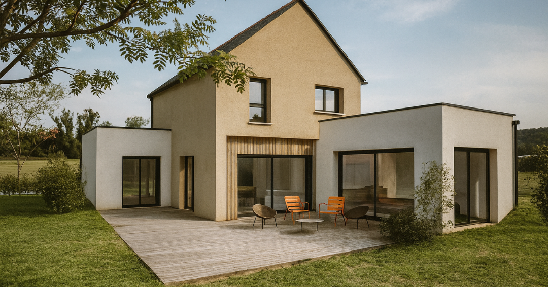 Cette maison contemporaine de 140 m² à Pacé a été pensée autour d’une grande pièce de vie en L, véritable cœur de la maison. Cet espace ouvert favorise les moments de convivialité tout en permettant une circulation fluide entre les différentes zones. La configuration en L offre une polyvalence d’aménagement idéale pour concilier vie quotidienne et réception.